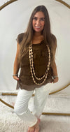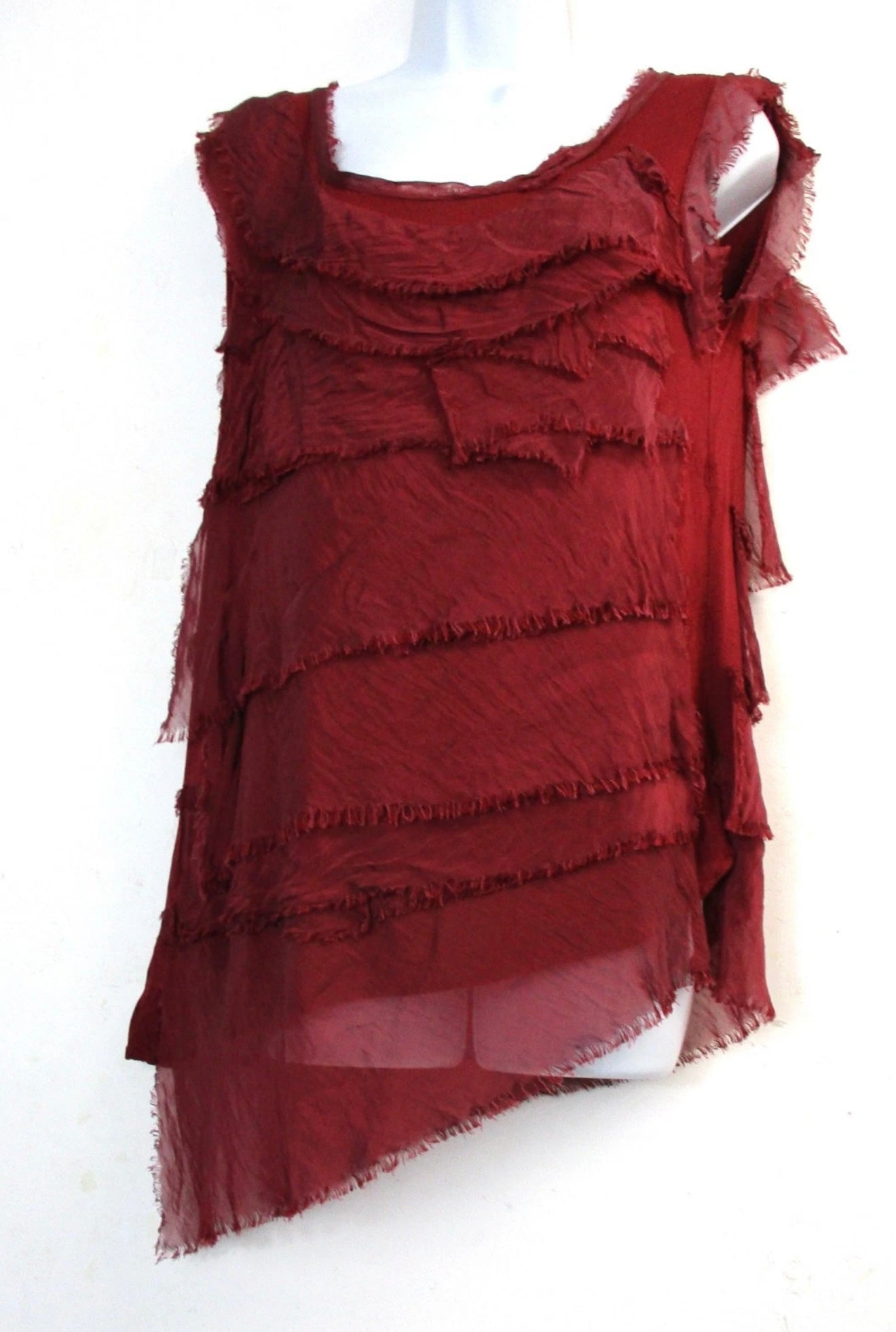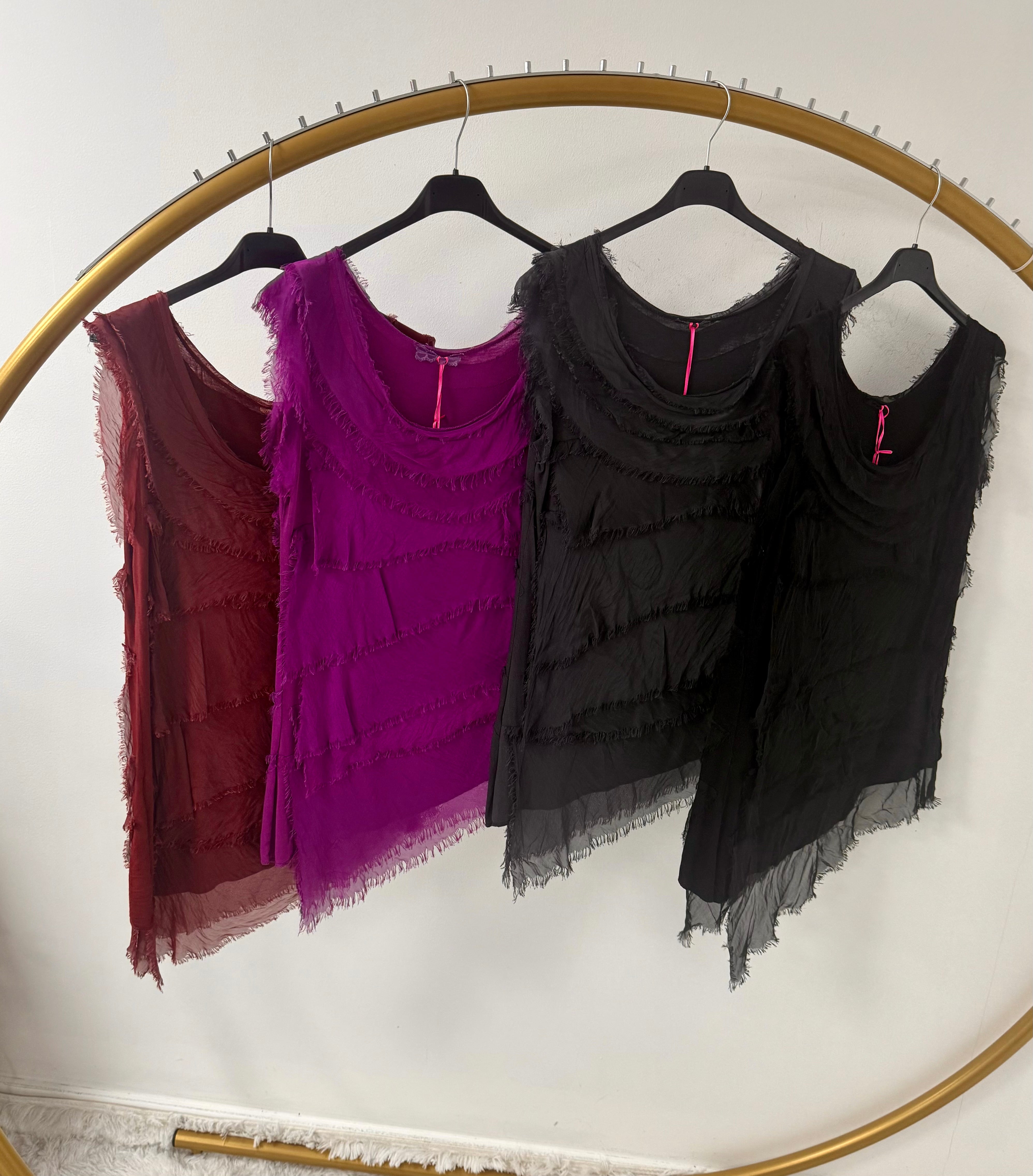 Beautiful ruffle silk top with rows of pretty silk flowing to a point at one side this truly is an amazing top to wear with jeans magic’s skirts or even shorts comes in choice of gorgeous colors and fits 10 to a big 14