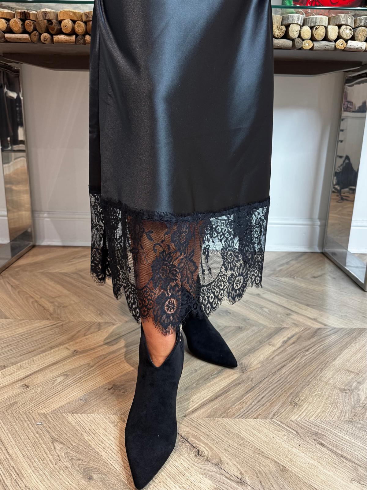 Bella is a classy black satin skirt with lace trim  Size 10-14