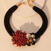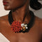 Featuring a chunky black cord base, it showcases a vibrant, intricately beaded red-orange floral motif.