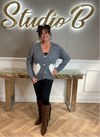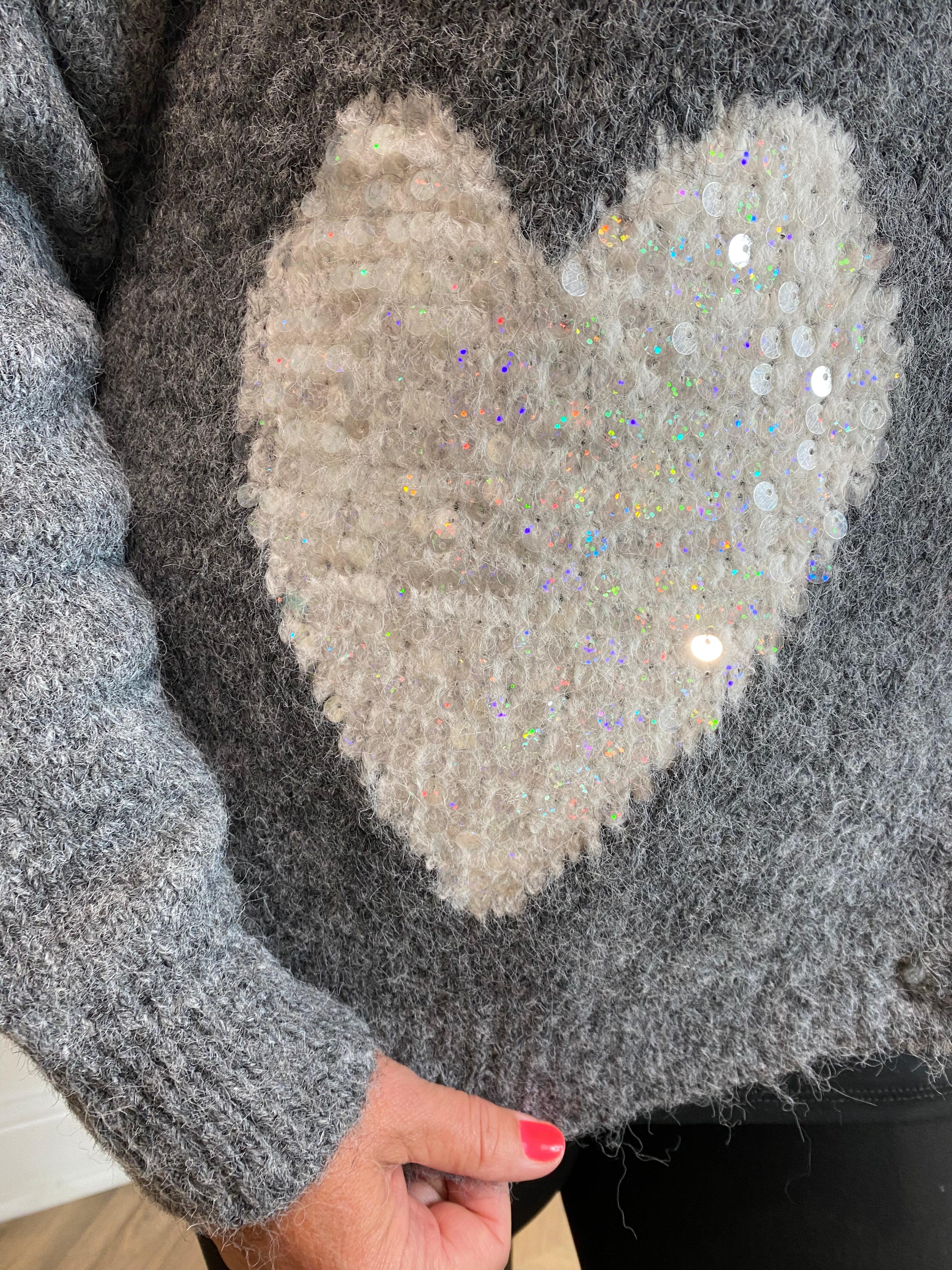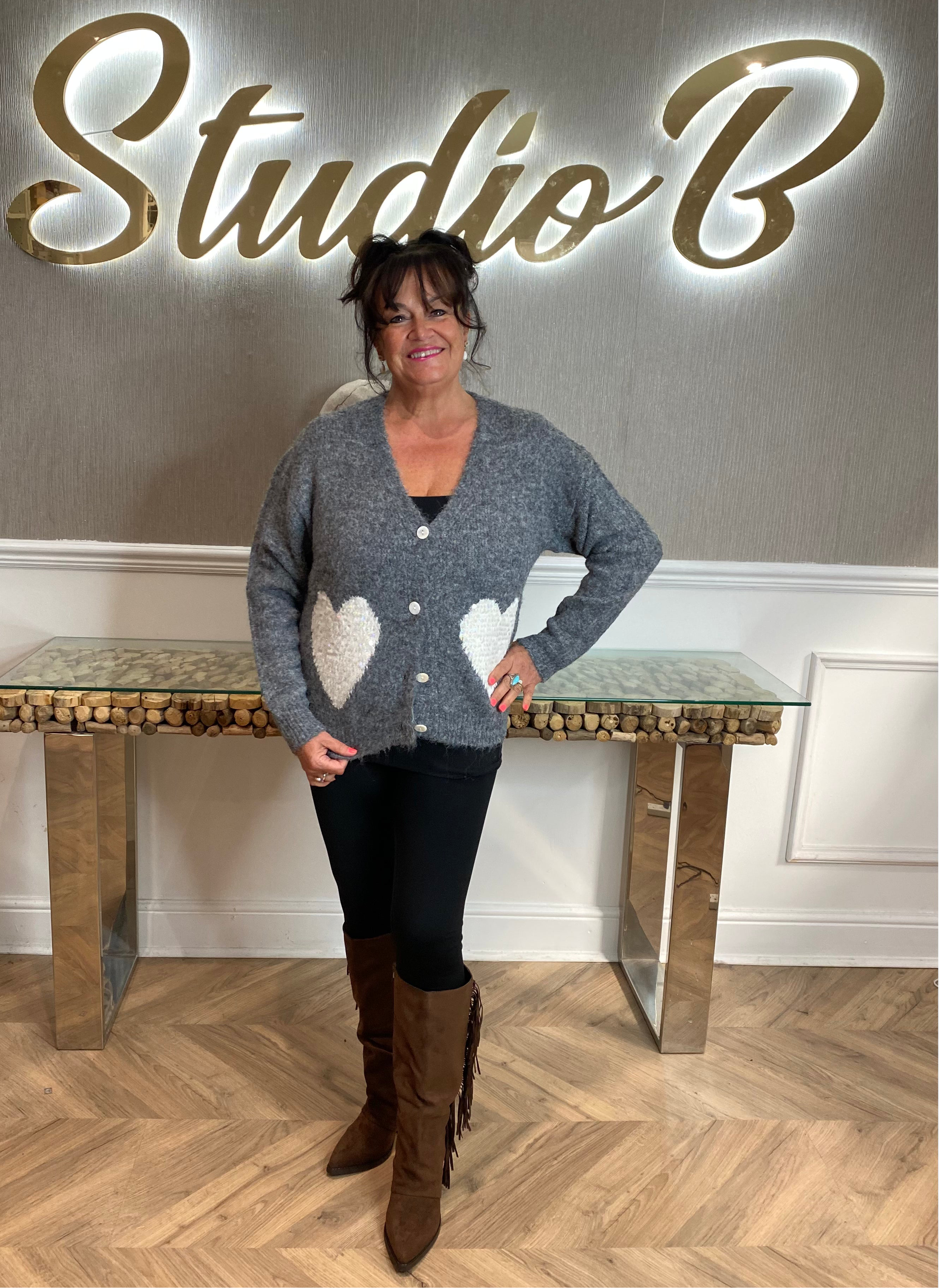 Callie is a quirky heart motive Cardi in a charcoal grey.