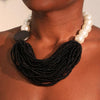 The multi-strand bib design, accented with a stylish wood disc, creates an eye-catching focal point.